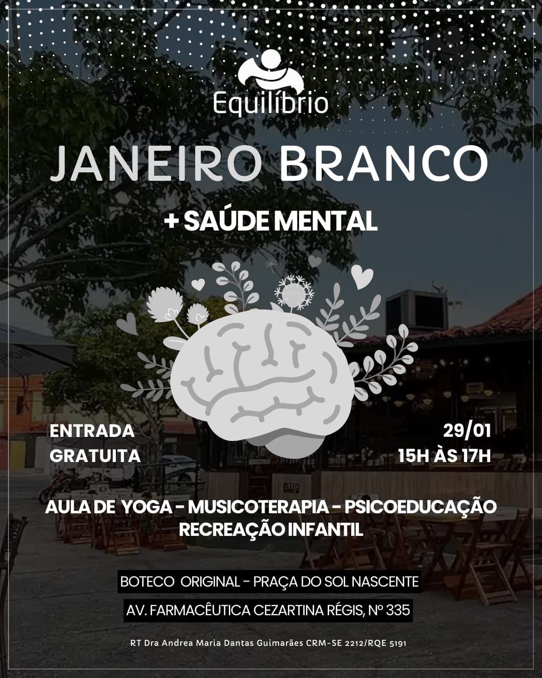 A Equilíbrio Clínica Dia, realiza na próxima quinta-feira dia 29 de janeiro, das 15h às 17h, uma ação especial em alusão ao Janeiro Branco, campanha nacional dedicada à conscientização sobre a importância da saúde mental.