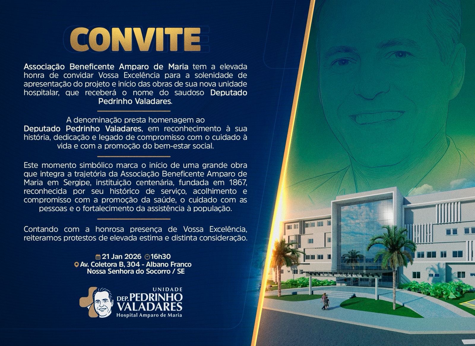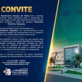 Nesta quarta-feira, 21 de janeiro, às 16h30, acontecerá o Lançamento da Pedra Fundamental da Unidade Pedrinho Valadares, nova unidade do Hospital Amparo de Maria, no município de Nossa Senhora do Socorro. O ato marca o início de um importante projeto voltado à ampliação da assistência em média e alta complexidade, fortalecendo de forma estruturante a rede de saúde da região, com previsão de conclusão das obras e entrega da unidade em dezembro de 2026. O evento acontecerá no local onde será construída a unidade, na Av. Coletora B, 304, bairro Albano Franco, em Nossa Senhora do Socorro.