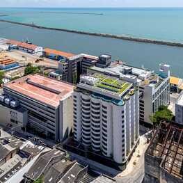 Essa integração entre memória industrial e arquitetura contemporânea se estende às áreas comuns, que incluem rooftops conectados por passarela, piscinas aquecidas, lounge bar, academia, salão de festas, espaços de convivência e vistas amplas para o mar e para o tecido histórico da cidade.