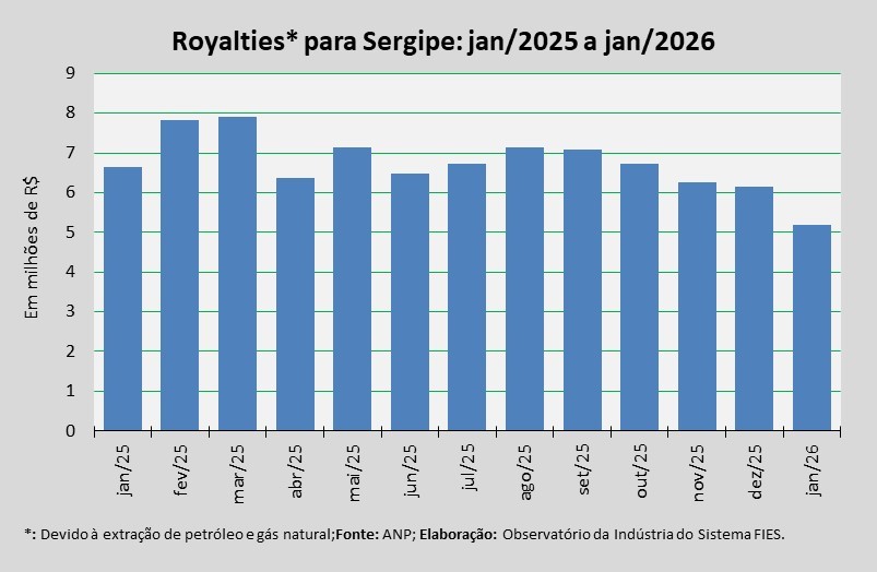 Análise realizada pelo Observatório da Indústria do Sistema FIES, com base nos dados da Agência Nacional do Petróleo, Gás Natural e Biocombustíveis (ANP), revelou que o pagamento de royalties ao Estado de Sergipe, referentes à extração de petróleo e gás natural do mês de novembro último, somou cerca de R$ 5,2 milhões. O valor, segundo a ANP, foi creditado em janeiro.